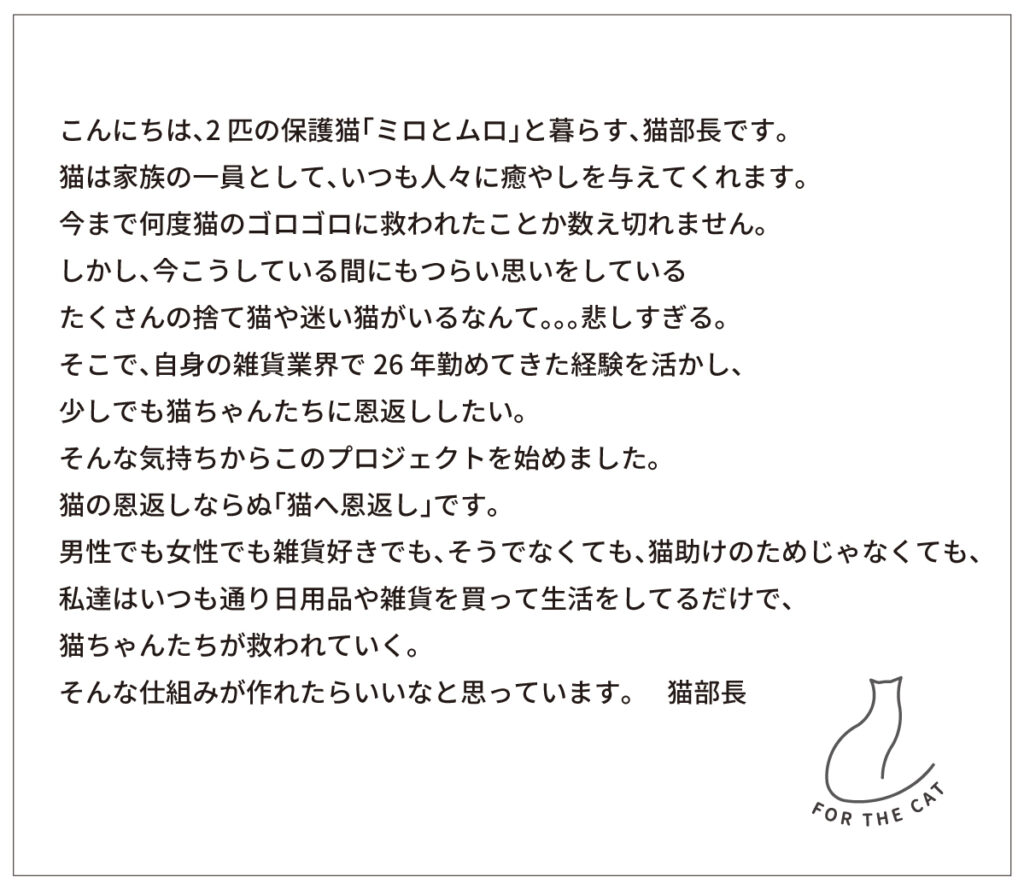 雑貨や日用品の売上の一部を保護猫支援団体へ寄付する活動を行っています。
